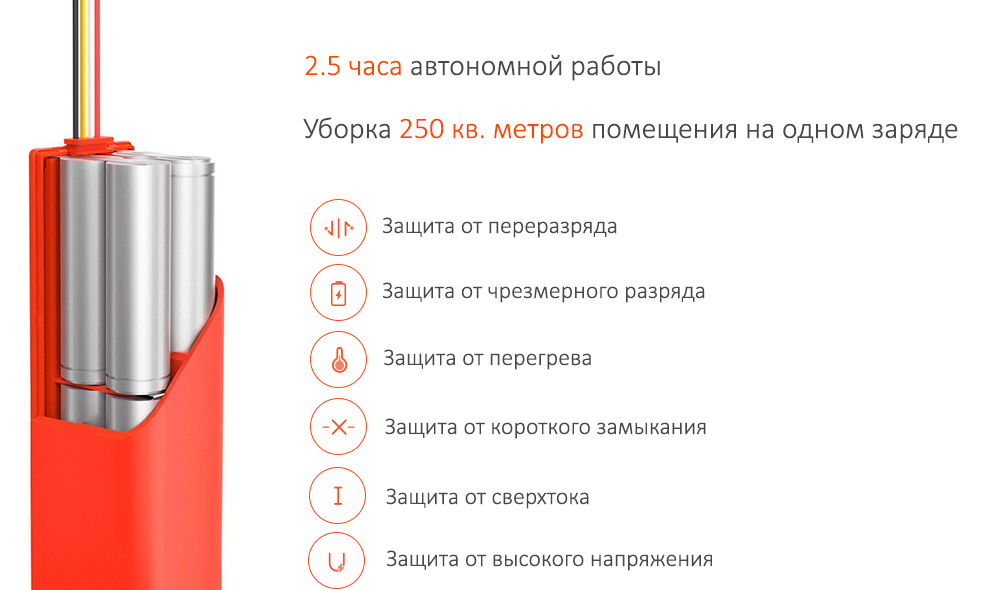 Устройство оснащено емкой литий-ионной батареей типа 18650 емкостью 5200 мА*ч. Срок автономной работы пылесоса достигает 2.5 часа, за это время он может убрать до 250 квадратных метров.